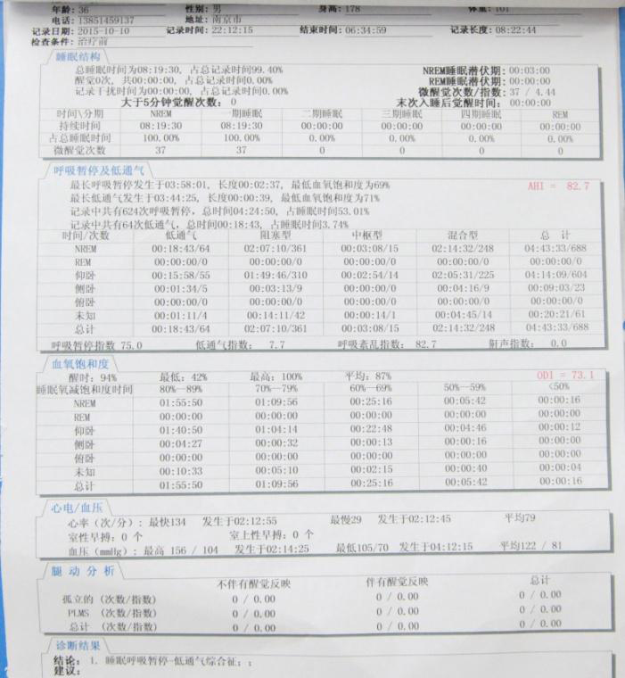 接收卢先生的医生正是南京仁品耳鼻喉专科医院耳鼻喉科医生王其峰主任,王主任在详细了解患者的情况后,为卢先生进行了检查。“鼾症是一种普遍的现象,形成它的原因有很多,像肥胖、内分泌紊乱、老年组织松弛、鼻部疾病阻塞气道等等都可以造成。卢先生属于肥胖体型,做过鼻部检查后发现,他还有肥厚性鼻炎和鼻中隔偏曲症状,此外我们又对卢先生进行了近九个小时的睡眠检测,发现AHI(指每小时睡眠内呼吸暂停加上低通气的次数)为82.7,记录中共有624次呼吸暂停,总时间为4小时24分零25秒,占总睡眠时间53%,记录中总共64次低通气,总时间为18分43秒。诊断为睡眠呼吸暂停—低通气综合症。”